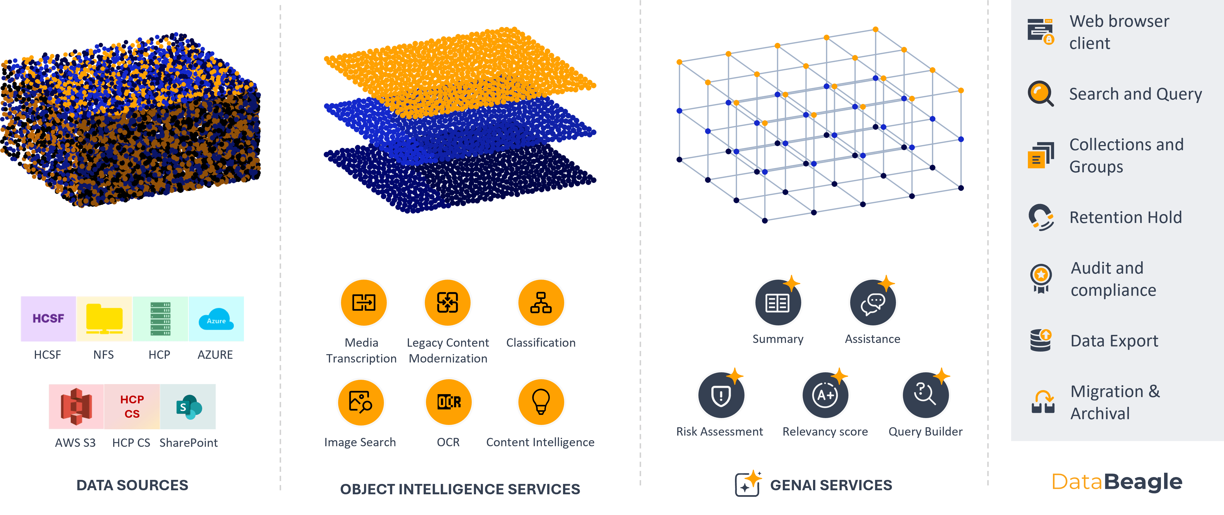 • Object Intelligence Services Leverage advanced tools like OCR, Media Transcription, Image Search, Legacy Content Modernization, and Classification to enhance data discovery and analysis.